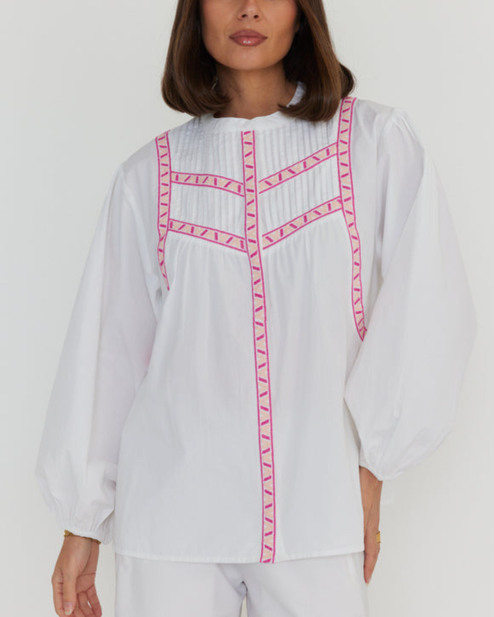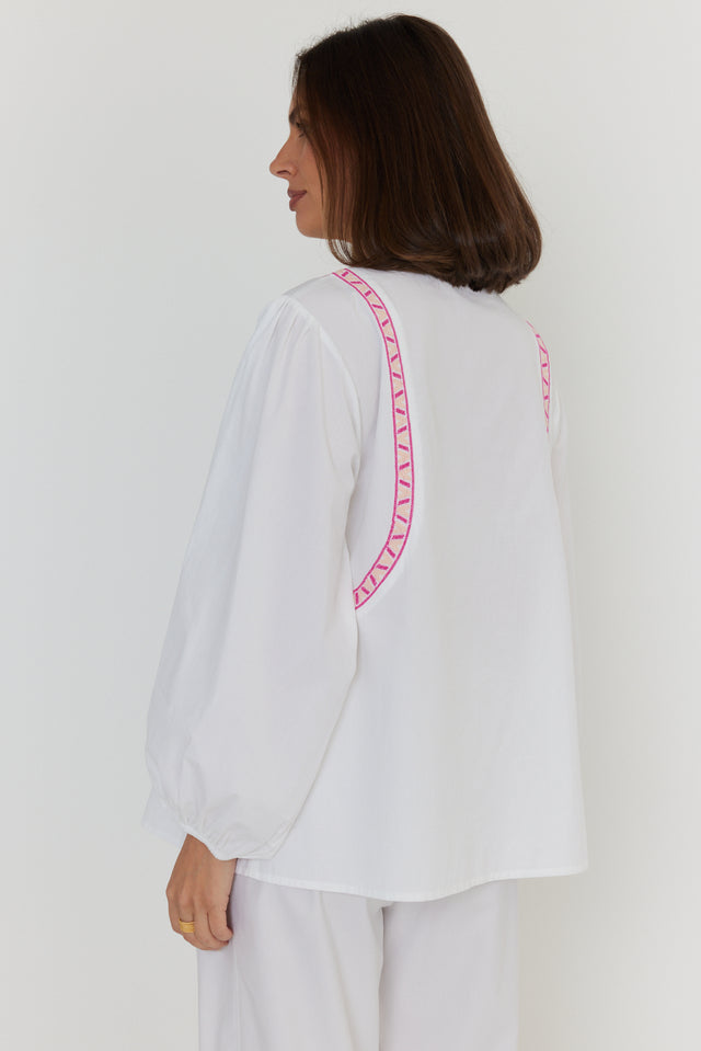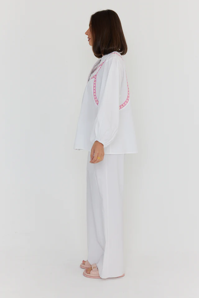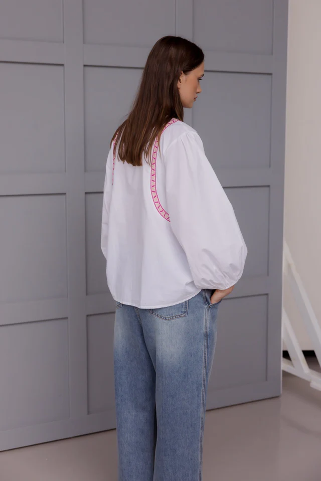 Finished with the signature Λ embroidered pink taping, this blouse pairs beautifully with denim, tailored trousers, or a linen skirt when you want a fresh, put-together look without the fuss. Add it to your rotation for easy styling across seasons.