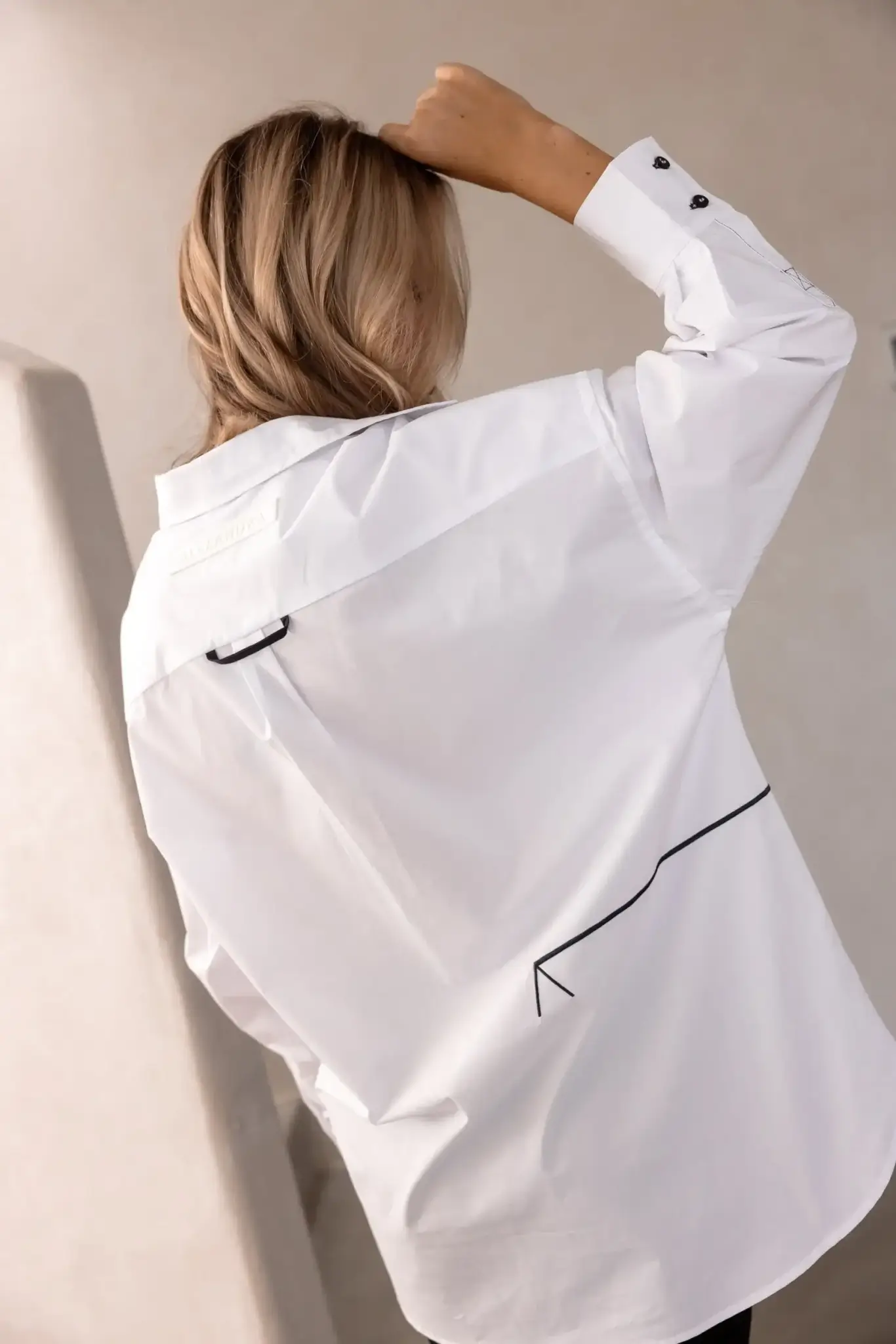 Designed with a classic button-down closure and scooped hems, it wears effortlessly loose, half-tucked, or layered over a tank. A contrast chest pocket and cuffed wrists with contrast buttons add a sharp navy hit, finished with contrast stitching for extra definition. A minimal illustration detail at the waist keeps the look unique without feeling loud, while branding at the back neck and a contrast loop at the back add the final considered touches.