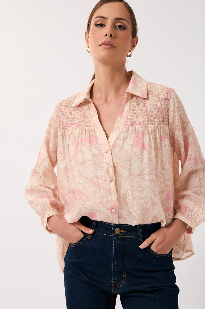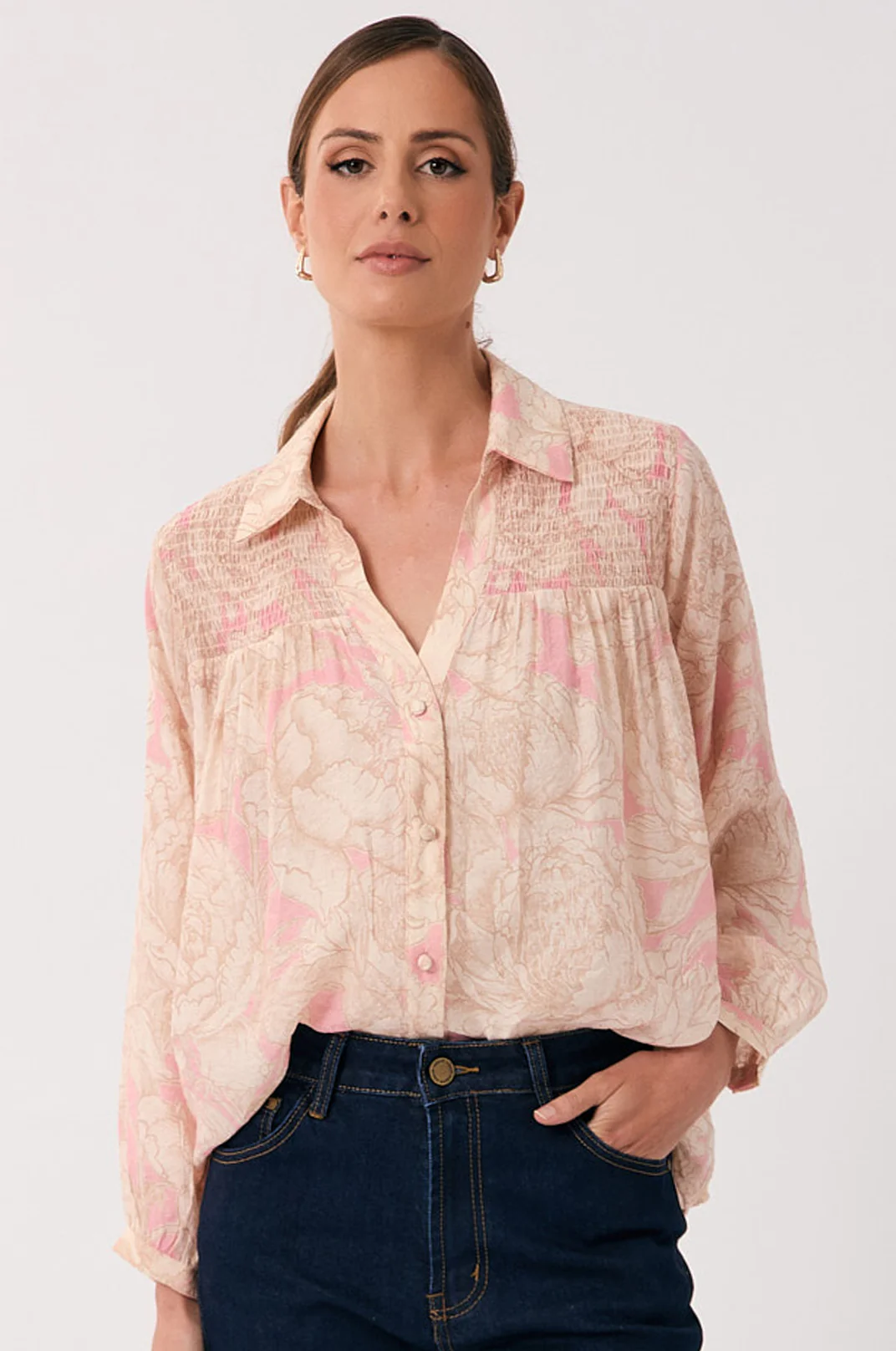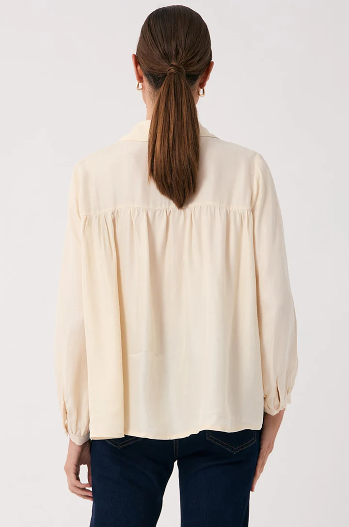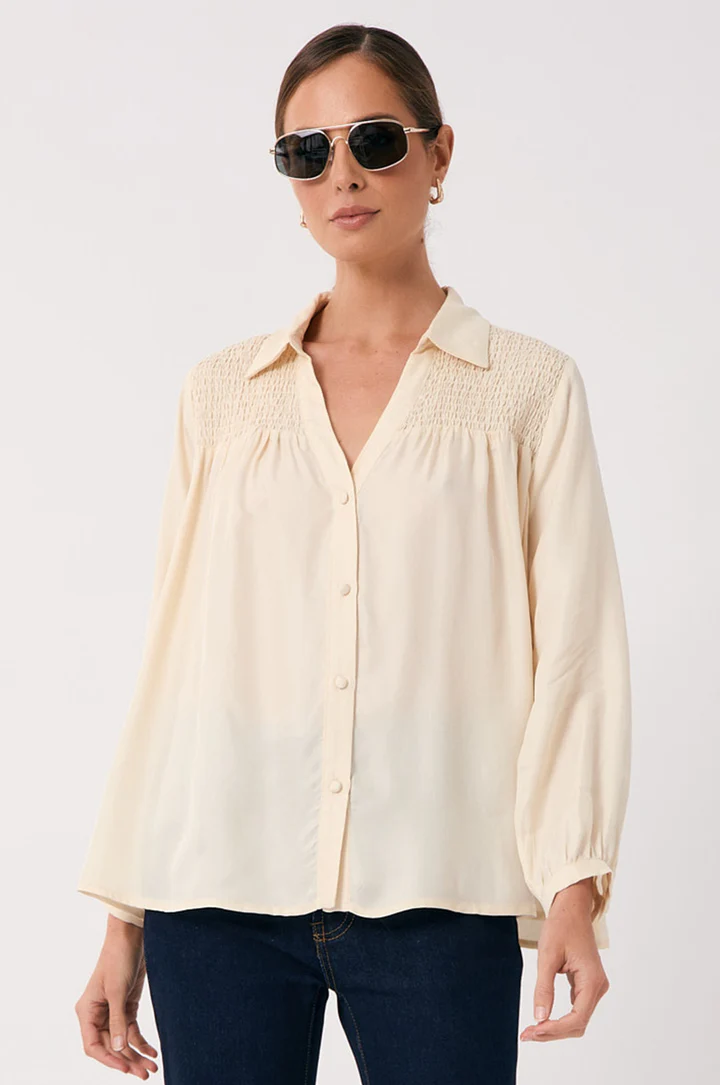 Soft, feminine, and effortlessly elevated, the Ginny Shirred Detail Top by Adorne is a versatile piece made to move from workdays to weekends with ease. Featuring a relaxed silhouette with delicate shirring across the chest, this top flatters without feeling fussy. The self-covered buttons and banded cuffs add a refined touch, while the cupro-viscose blend offers a smooth, breathable feel against the skin.