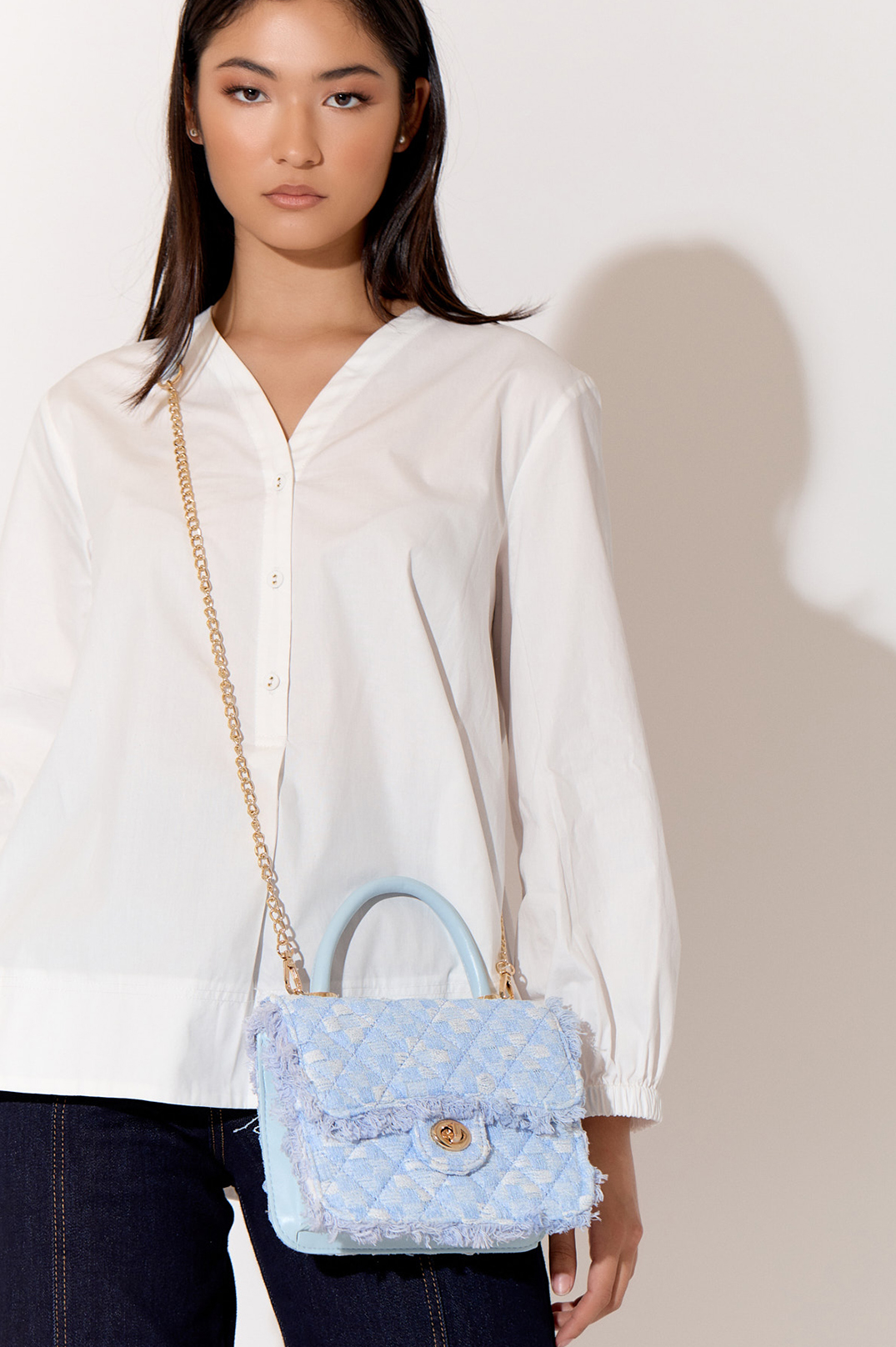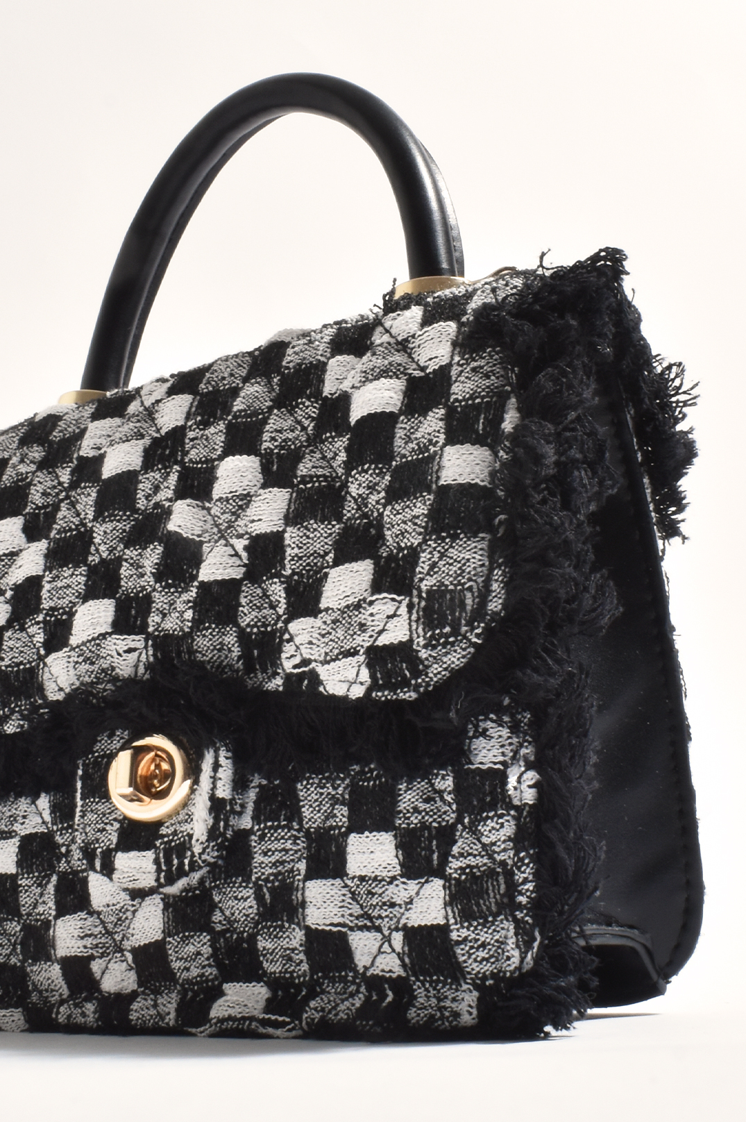 - Materials: Boucle, Vegan Leather & Plated Metal
